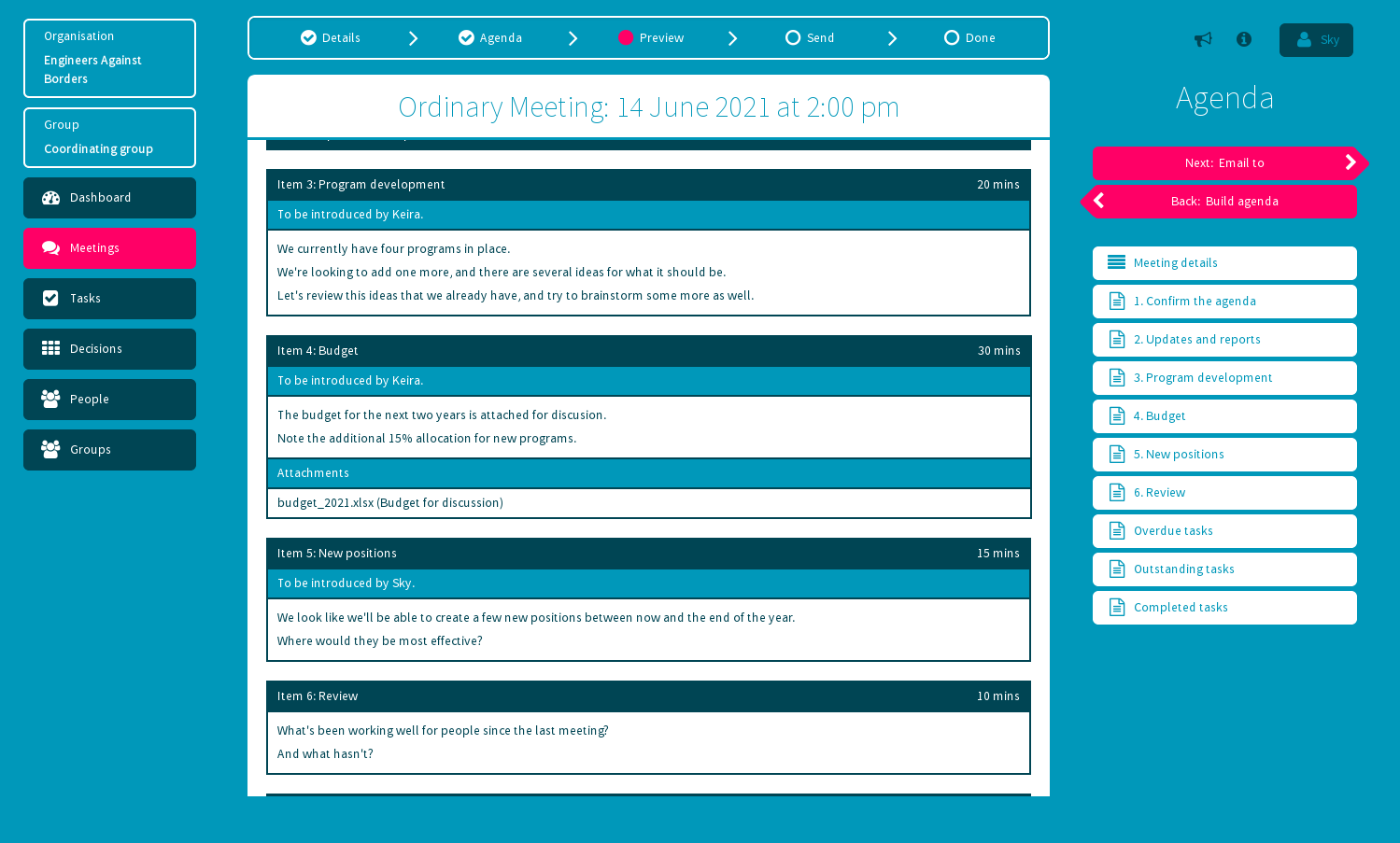 Meetniq is designed to guide you toward being better organised and having good meetings. It'll remind you to assign tasks to people, help record your decisions clearly and make sure that meetings finish on time.